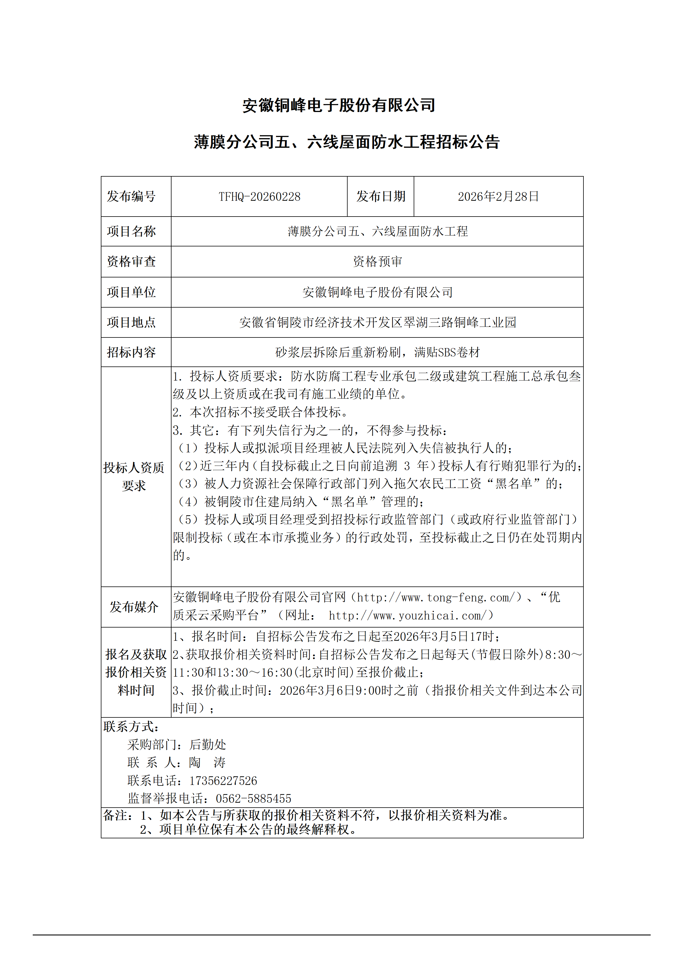 01安徽銅峰電子股份有限公司 (薄膜分公司五、六線屋面防水工程 招標(biāo)公告)_01